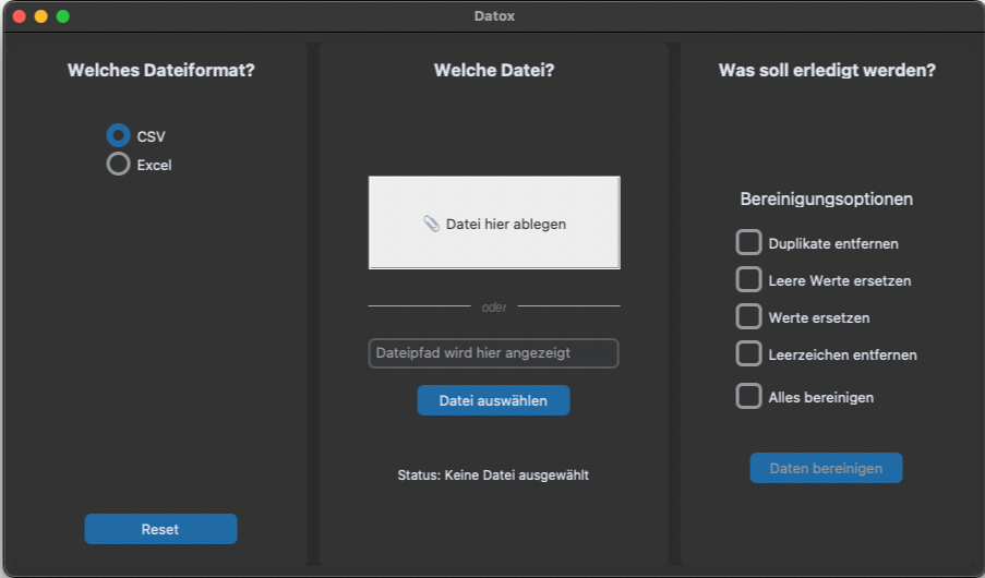 Zieh deine CSV- oder Excel-Datei per Drag & Drop ins Tool, wähle einzelne und smarte Reinigungsoptionen – oder starte alles mit einem Klick. Vollständig lokal, 100 % sicher und im Wunschformat speicherbar (Excel oder CSV). Saubere Daten, ganz ohne Aufwand.